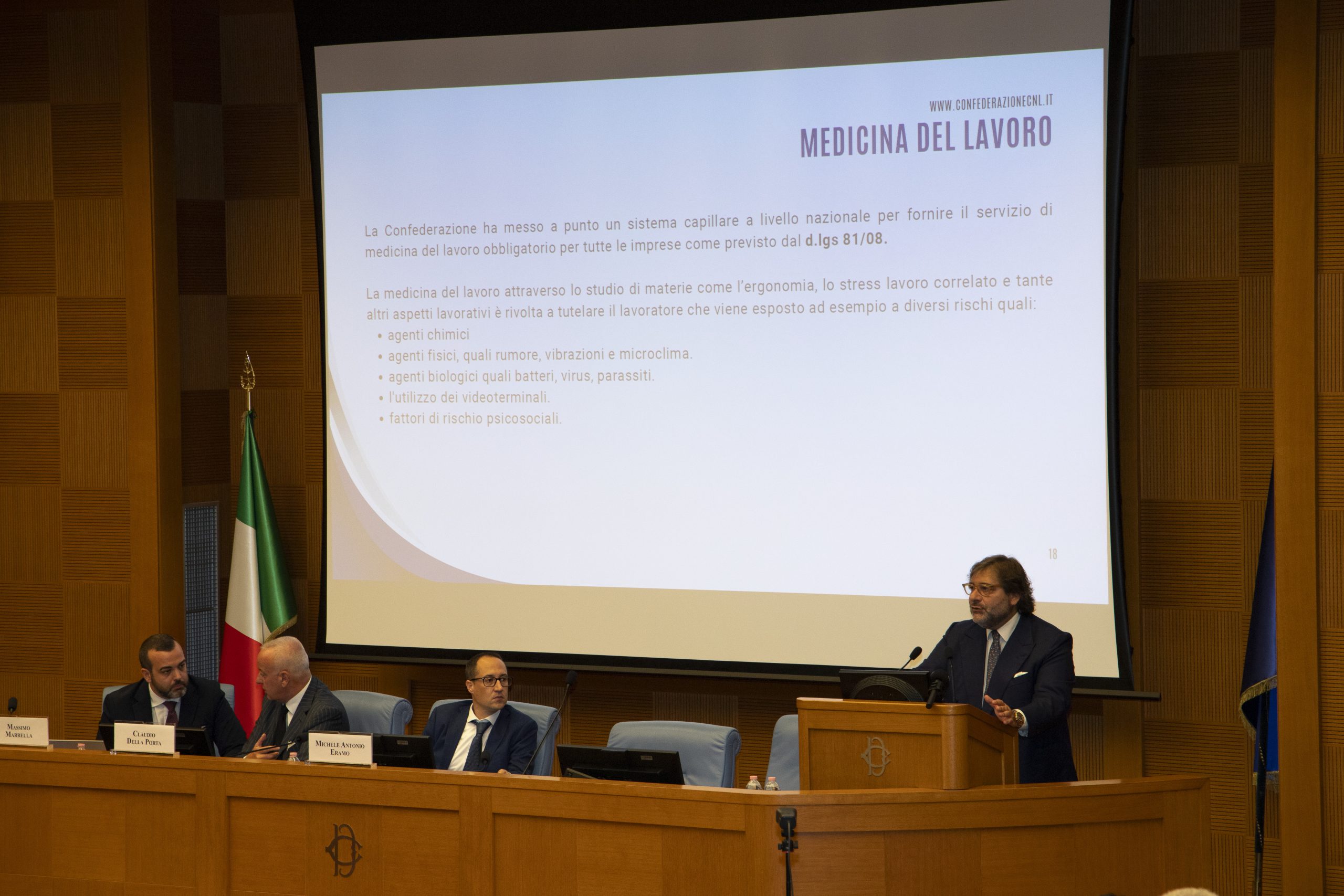 Sono intervenuti Rosanna Russoniello, Consigliere Nazionale Confsal; Mario Alberti, Segretario Generale Confimprese Viterbo Referente U.NI.TI Regione Lazio; Gianfranco Piazzolla, Presidente Confimprese Viterbo; Armando Valiani, Segretario Regione Lazio UGL; Fabrizio Benedetti, Coordinatore Generale Consulenza Tecnica Salute e Sicurezza INAIL; Pietrangelo Massaro, Vice Coordinatore Romano Forza Italia; l’On. Angelo Tripodi, Consigliere Regione Lazio, Presidente IX Commissione Lavoro, Formazione, Politiche Giovanili, Integrazione sociosanitaria, Welfare e l’Architetto Wladymiro Wysocki, esperto della sicurezza che ha preparato un intervento sulla “Patente a crediti”.
